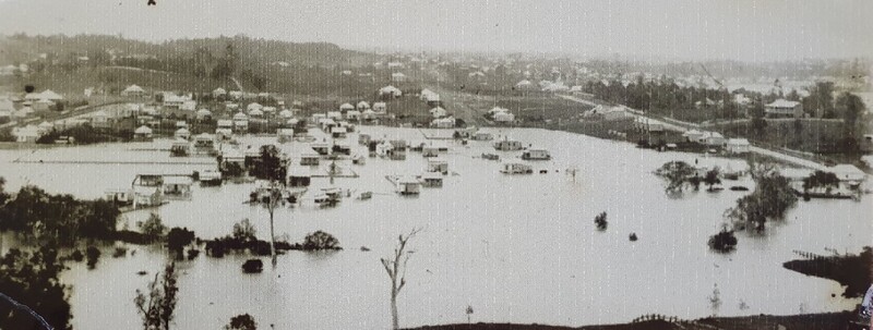 This image shows Swan Hill during the major 1893 flood. It is taken from the hill that is now home to the RBWH, with Downey Street City Farm in the front, Bowen Bridge Rd on the right and Newmarket Road across the top. The church was not inundated and was used as a refuge center for the community. It served, again, as a refuge during the 2022 floods, as it did in 1974 and 1937.