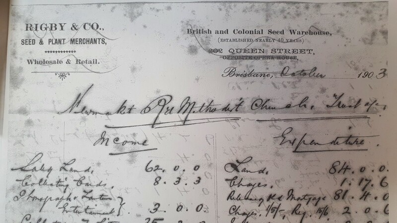 In 1902 the building was moved, as a whole, up the road to its current position and was known as Newmarket Rd Methodist Church. Some sources say the move was completed to get further away from future floods, some say, it was moved to gain a more prominent position. Arnold Rigby notes, that the move caused quite a traffic jam, when a steam traction engine pulled the building up Green Tce. I have not found any newpaper article or photo of that move. The first notice is a newspaper article, advising that the first service on Newmarket Rd was to be held on Sunday, November 23 in 1902. To this day, the building is 9 inches out of plumb, possibly as a result of the move. (First image held by the church)