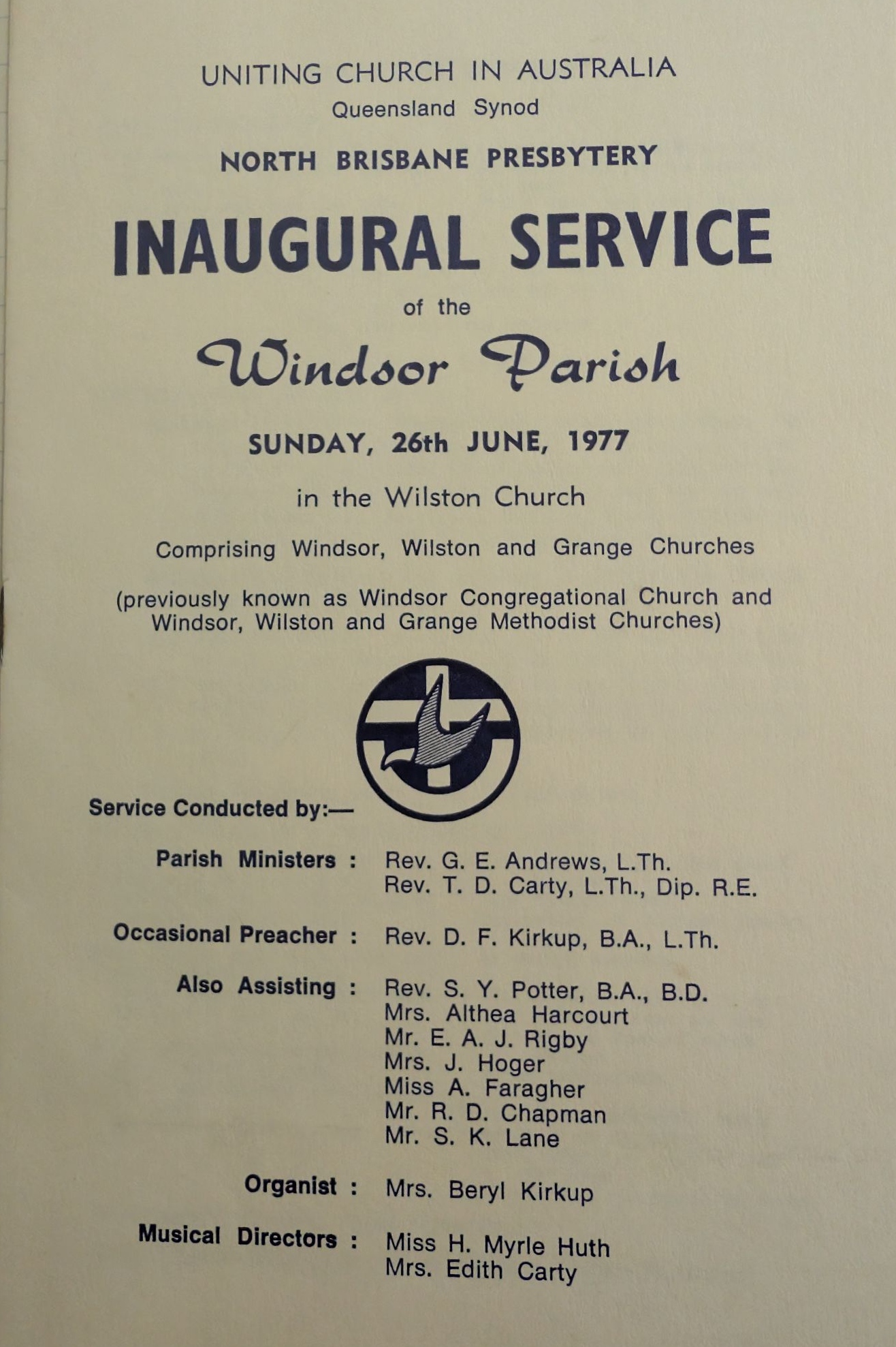 1977 saw Windsor Methodist Church Circuit (Grange, Wilston, Windsor) and Windsor Congregational Church form Windsor Uniting Church as part of the wider, newly formed, Uniting Church of Australia. The Presbyterian Church (cnr Maygar St and Whish St), chose not to join Windsor Uniting Church. Prior to the Union, there were joined evening services of the Congregational and Methodist churches, usually held in the Congregational Church building (217 Lutwyche Rd, now demolished). After Union, services in the Congregational Church building ceased. The inaugural service on 26 June 1977 in Wilston was attended by 171 named parishioners.